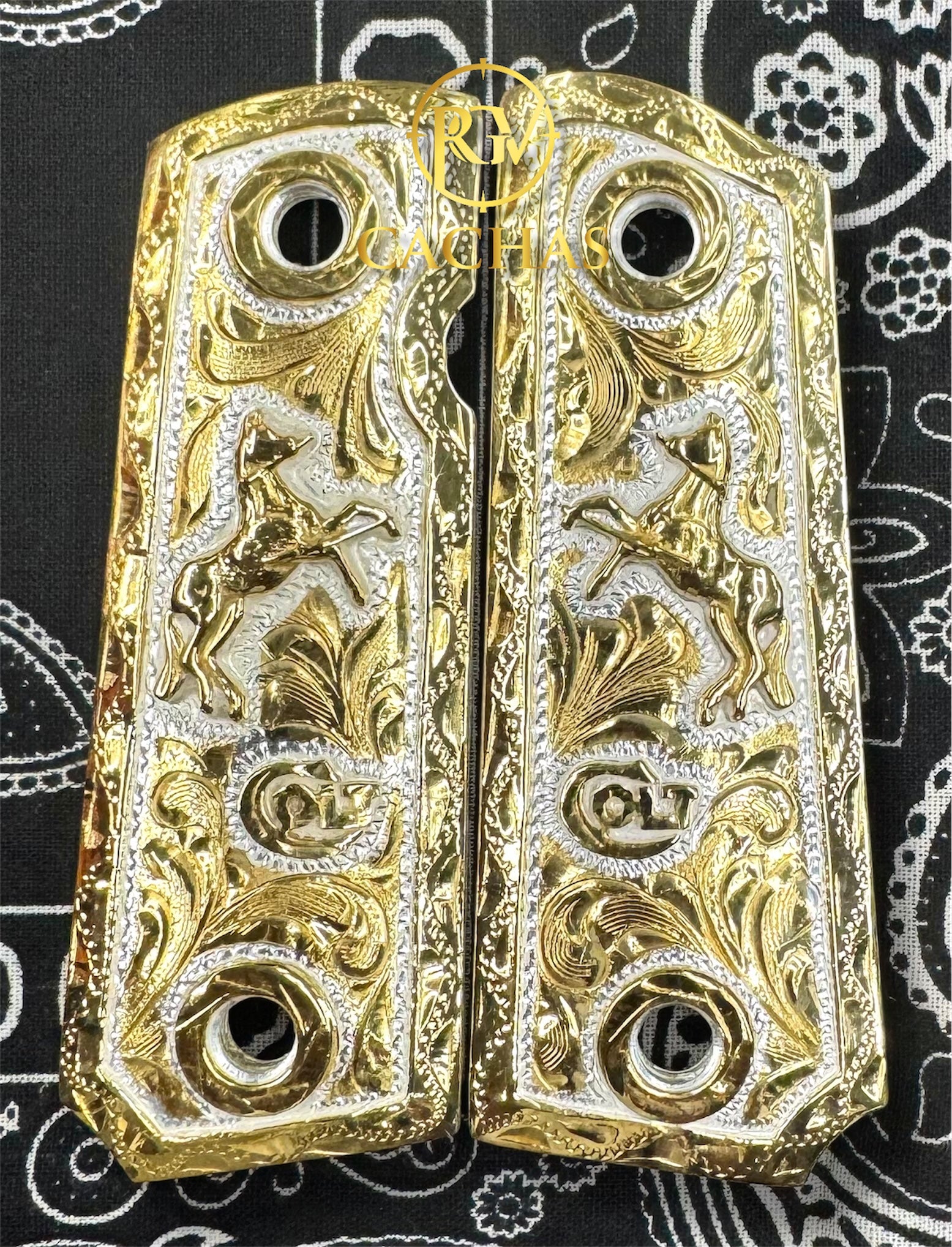 24K Real gold plated Colt logo and horse on nickel plated engraved grips.