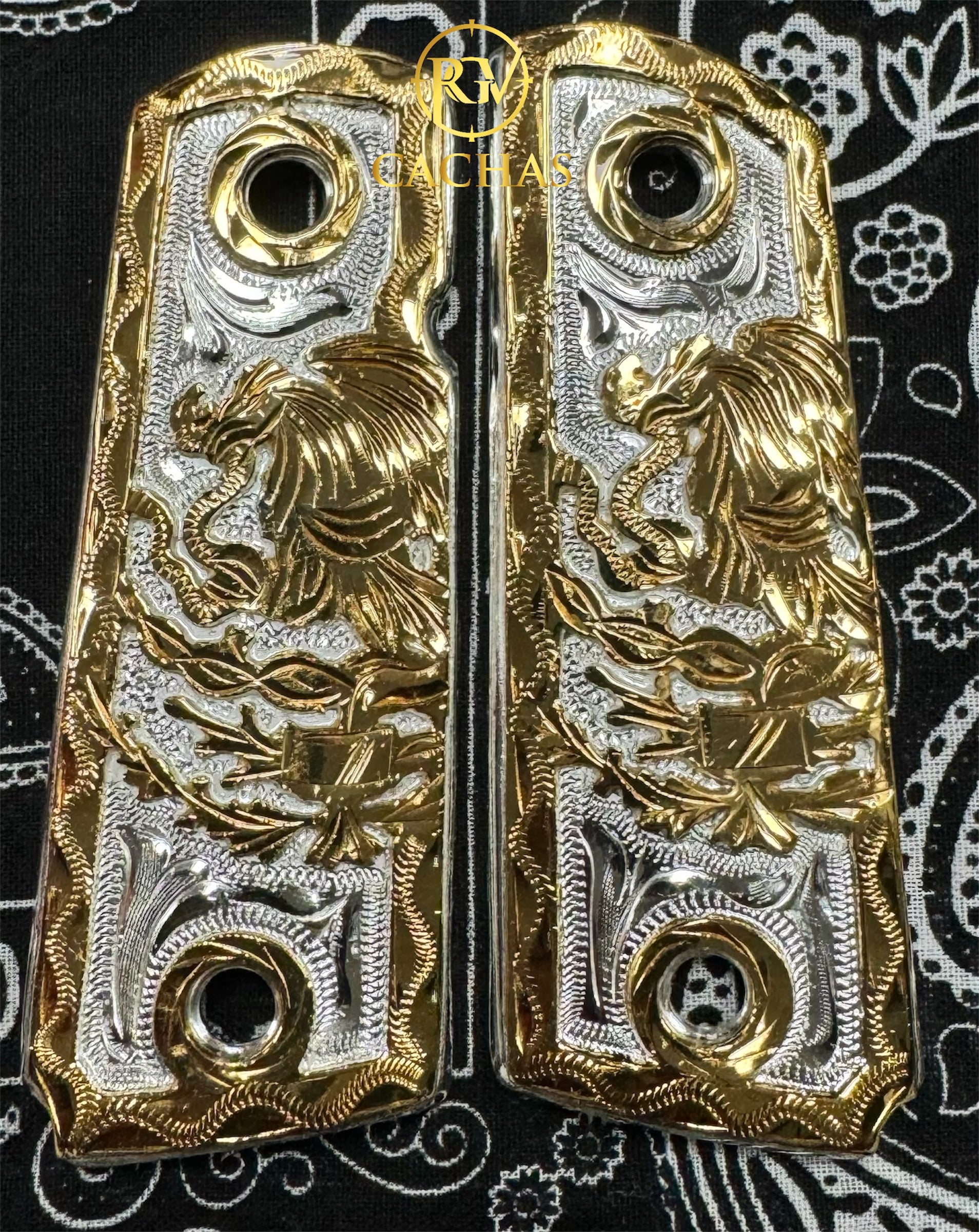 - 24K Real gold plated Mexico Eagle on nickel plated engraved grips.