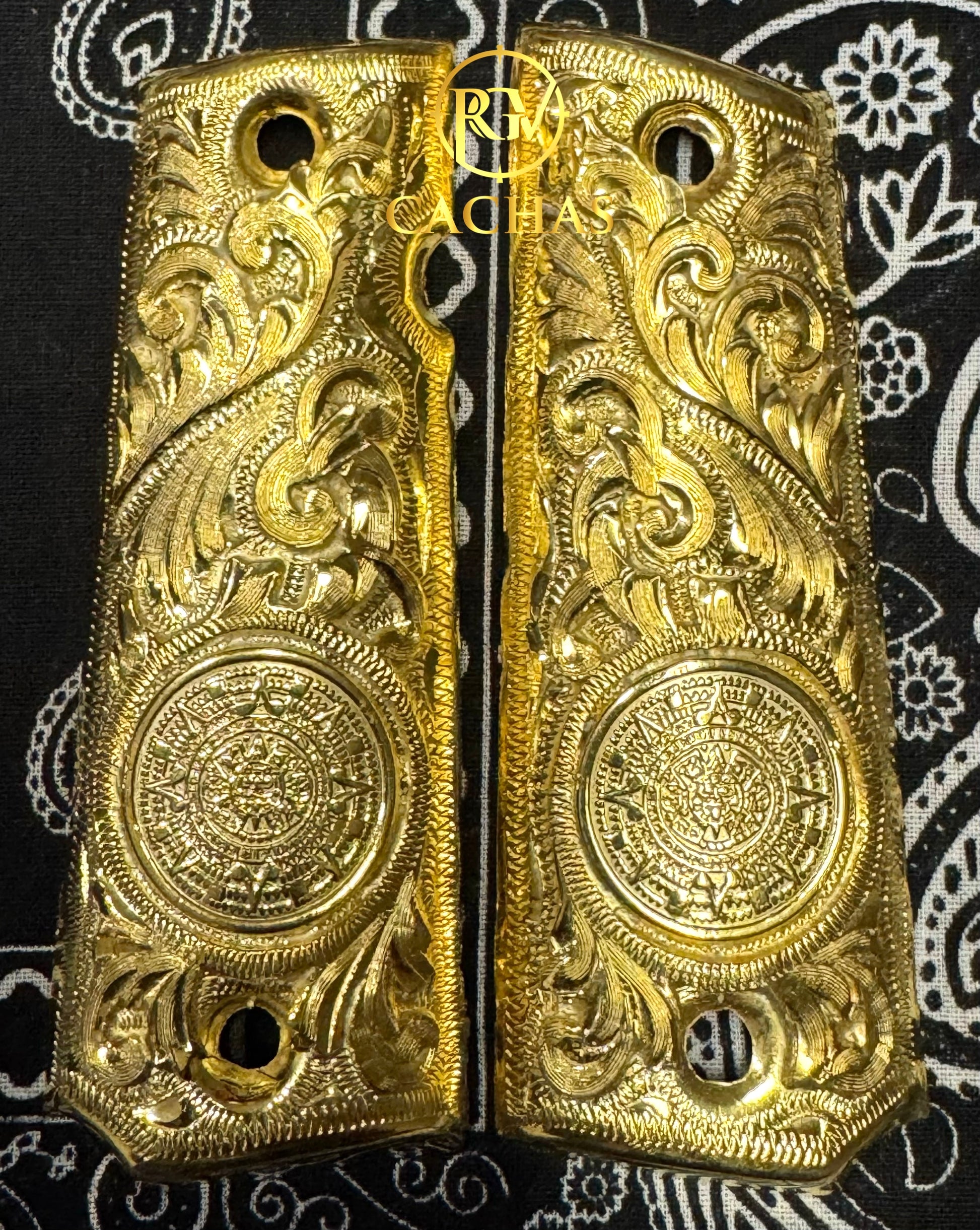24K Real gold plated Calendario Azteca on scroll engraved grips.