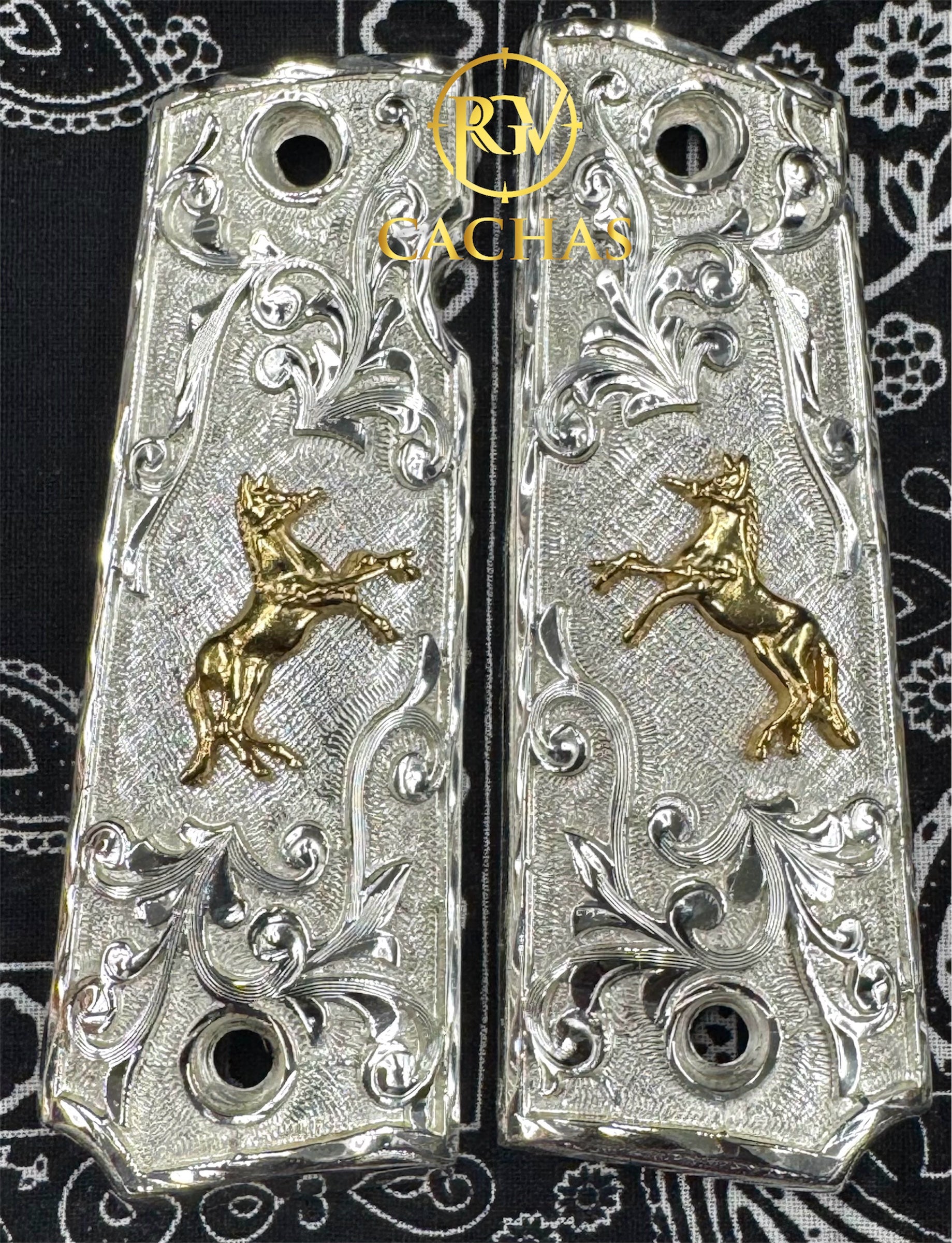24K Real gold plated Colt horse on nickel plated scroll grips.