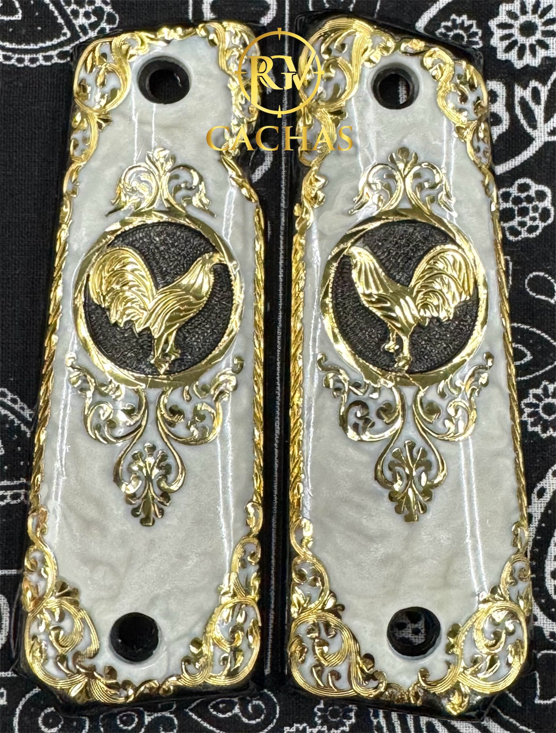 24K Real gold plated Gallo and scroll work on black grips with white pearl resin.