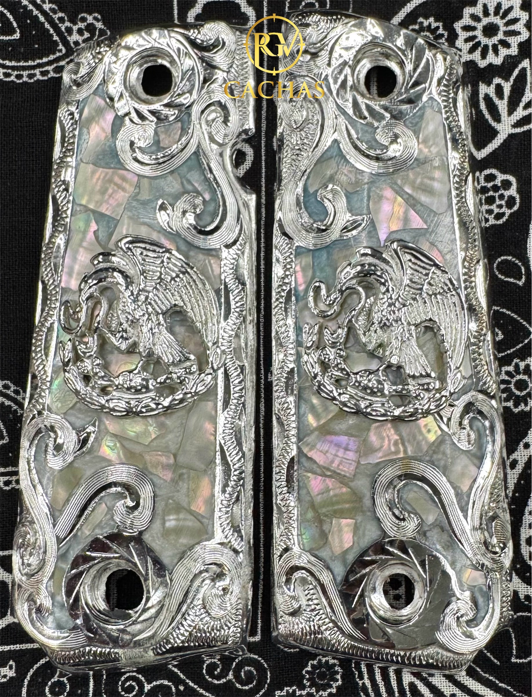 Nickel plated Mexico Eagle grips with concha nacar.