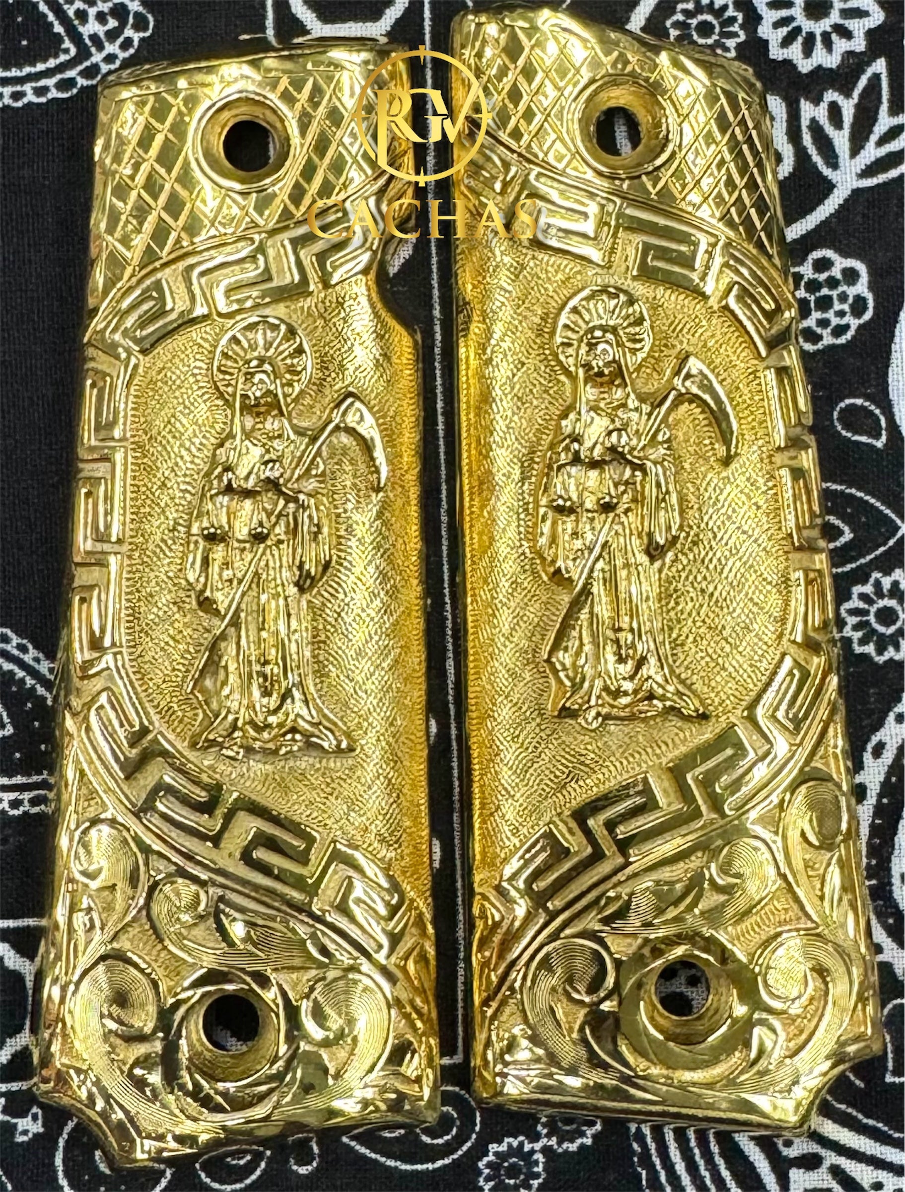 24K Real gold plated Santa Muerte and Greek border engraved grips.