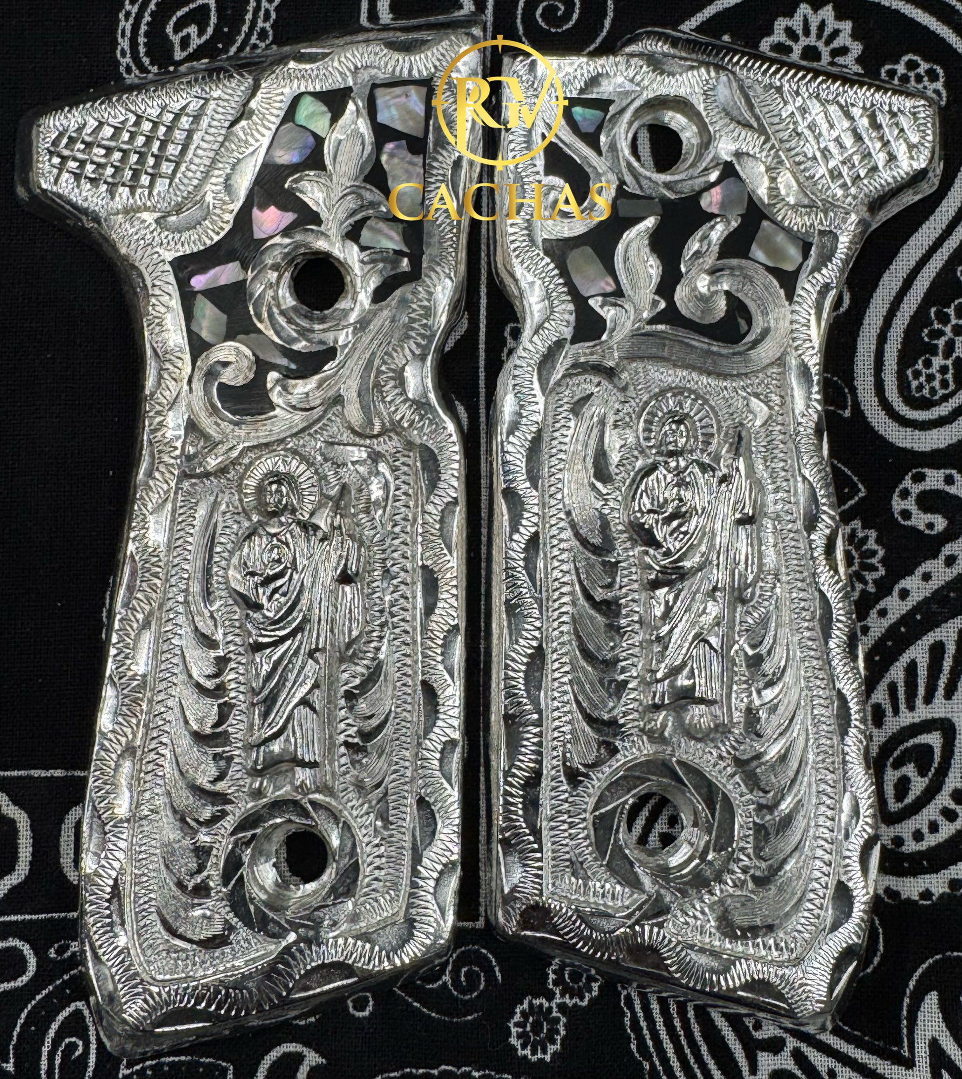 Nickel plated San Judas engraved grips with black resin and concha nacar.
