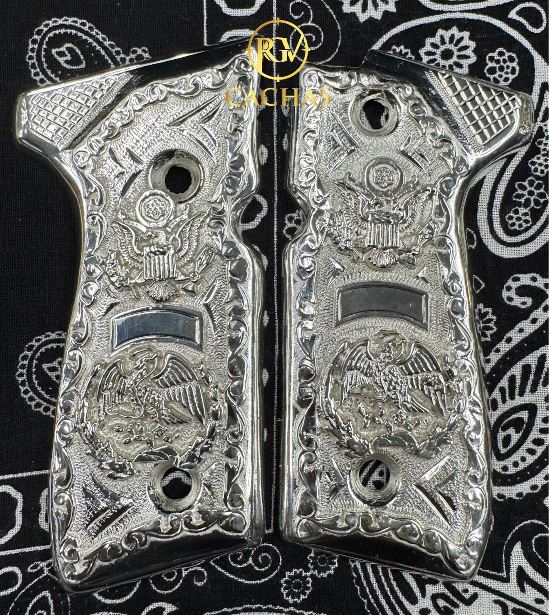Nickel plated United States bald eagle and Mexico eagle scroll engraved grips.