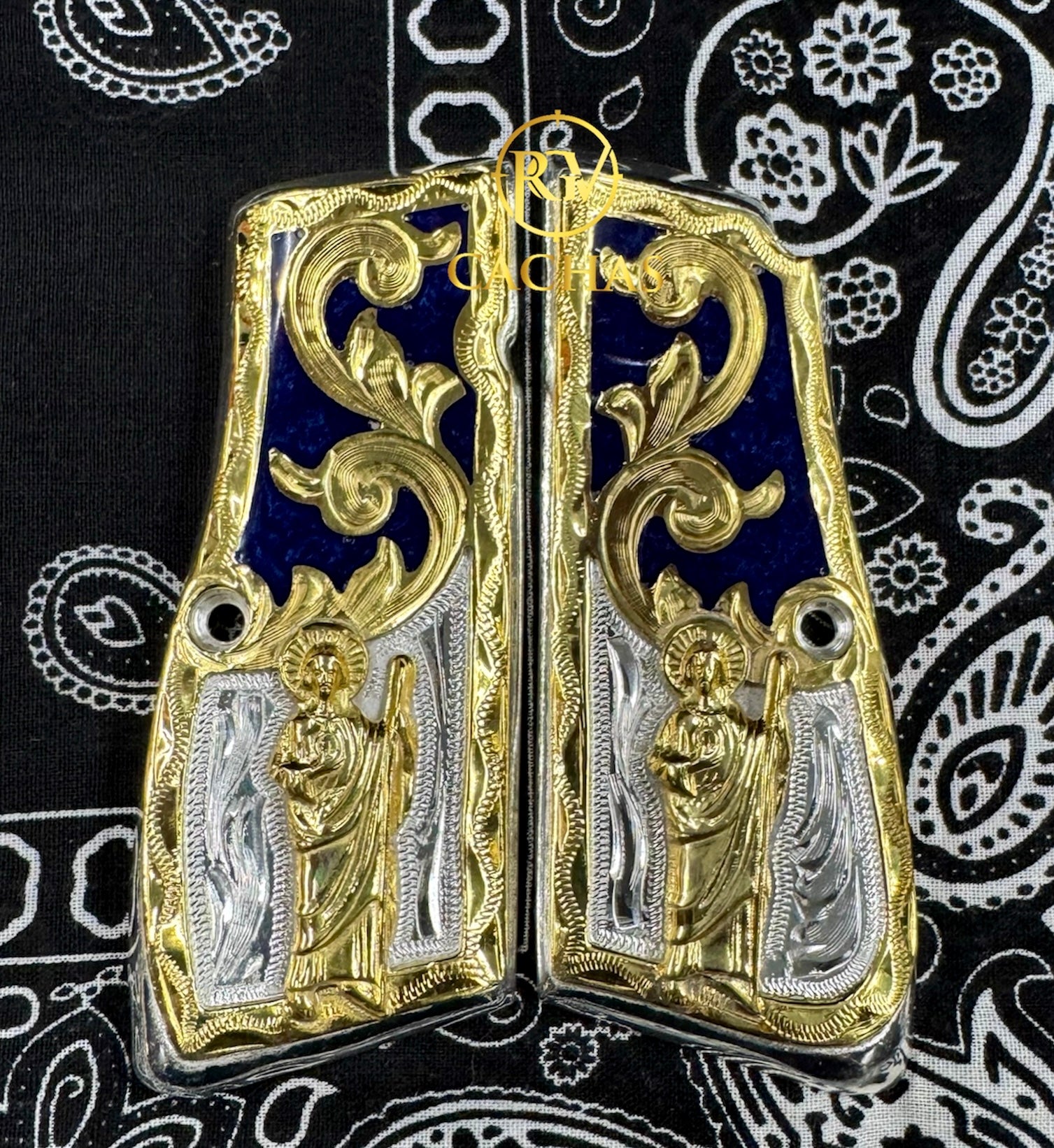 24K Real gold plated San Judas and scroll work on nickel plated engraved grips with black resin.