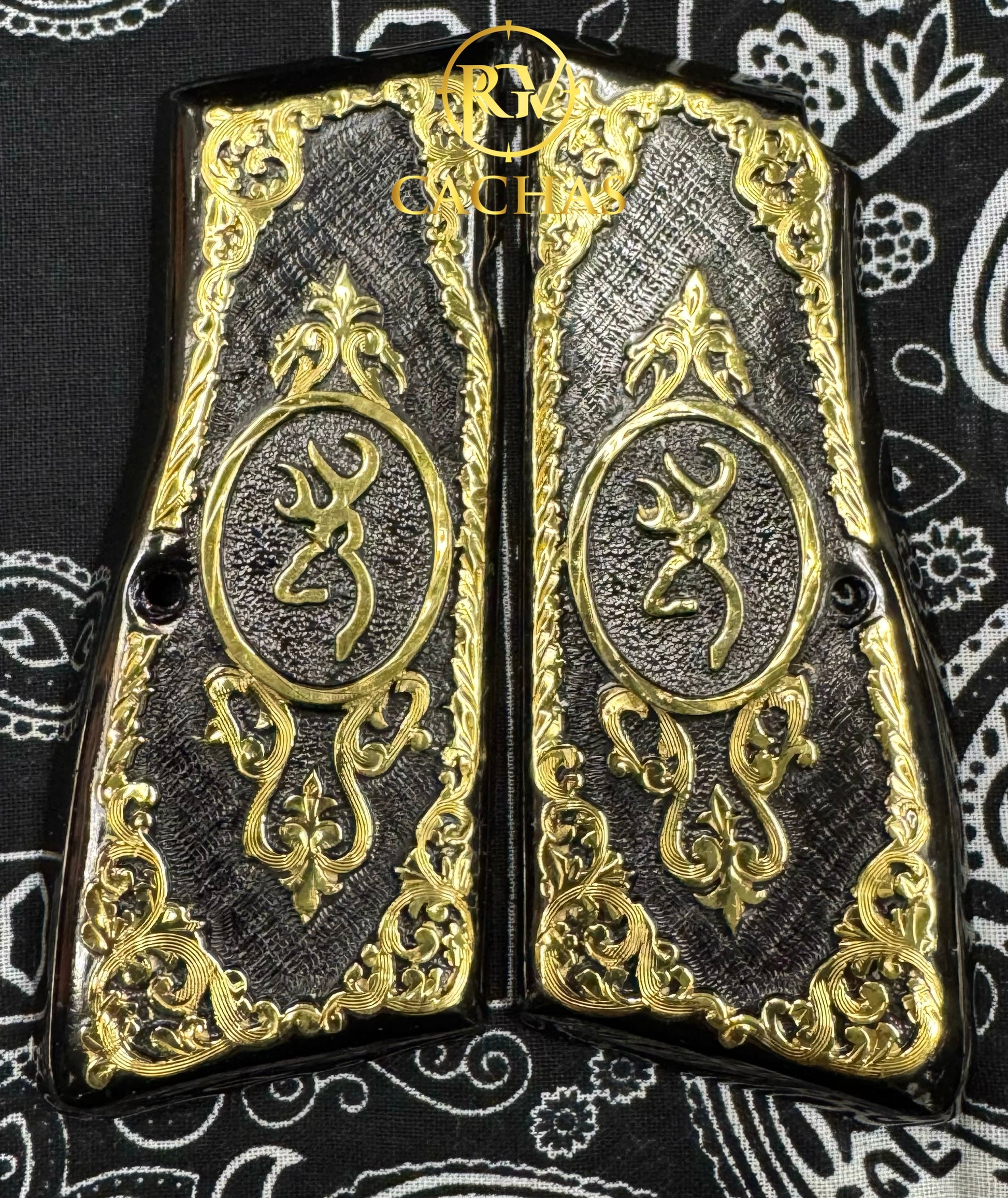 24K Real gold plated Browning logo and scroll work on black engraved grips.