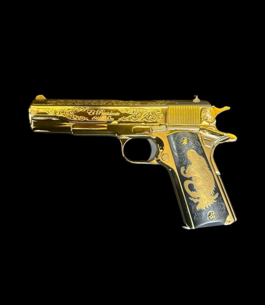 Limited edition model, one of only 500. The slide features the engraving 'El Presidente De Oro' on both sides.