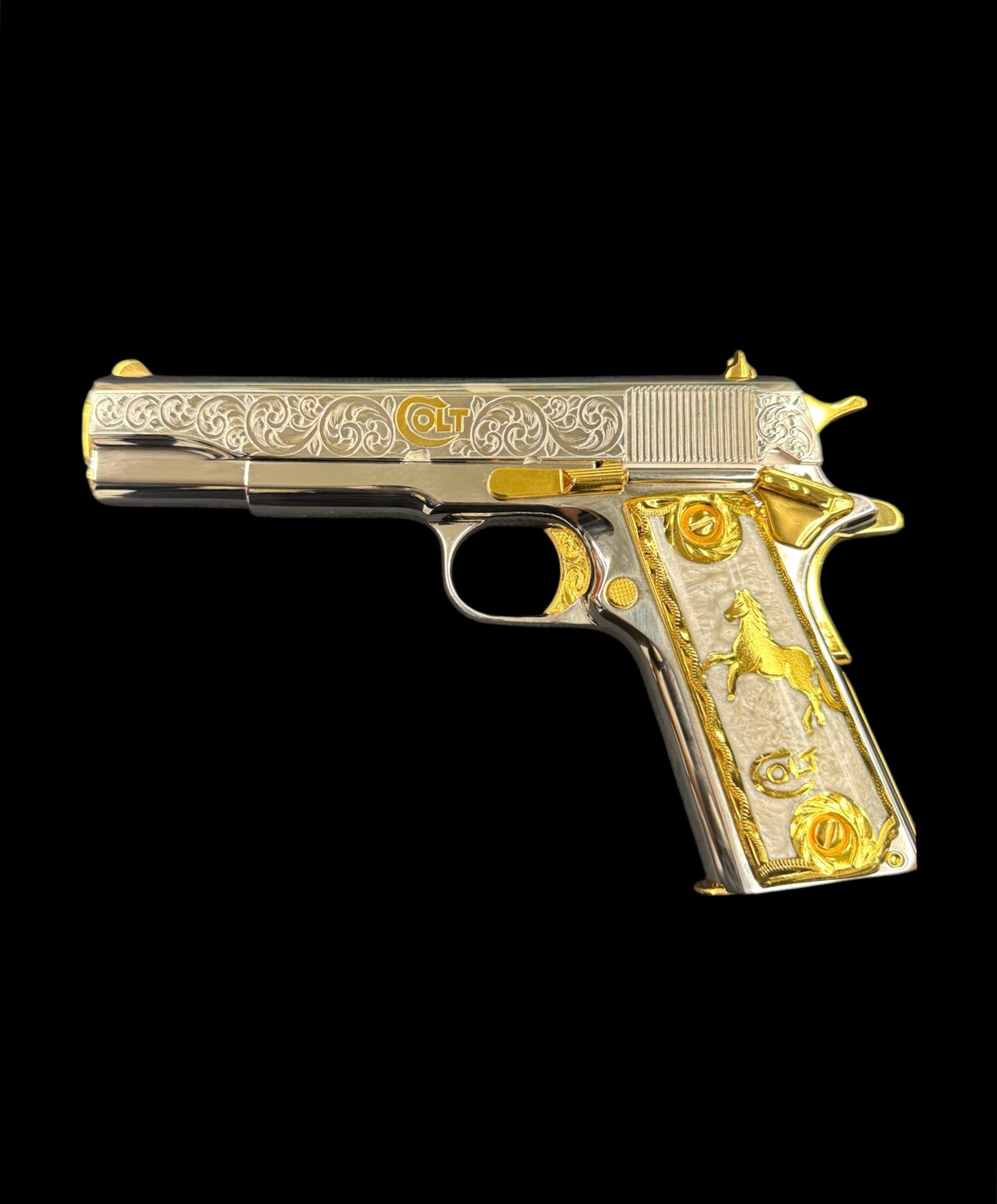 24K bright gold plated Colt logo horse grips with white pearl resin.