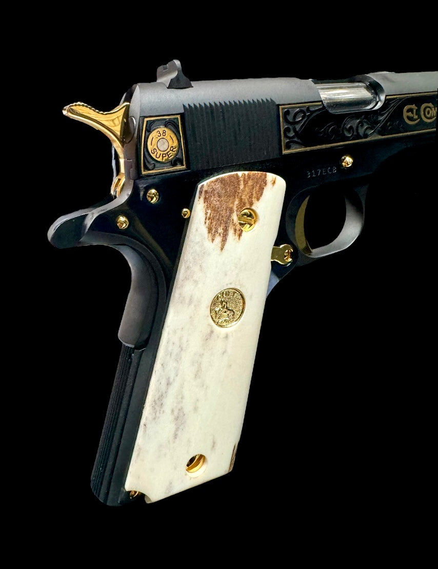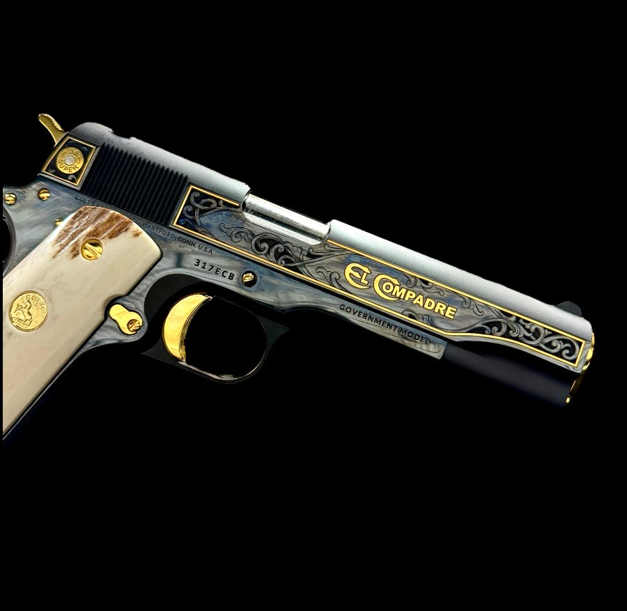 Colt 1911 "El Compadre" semiautomatic pistol chambered in .38 Super. Limited to only 500 pieces. High polished blue finish with scroll engraved slides. High polished 24k bright gold plated hardware with gold rampant Colt on the left side of the slide, vine scroll borders, and "El Compadre" on the right side of the slide. Exhibition grade polished eld shed grips with gold Colt medallions.
