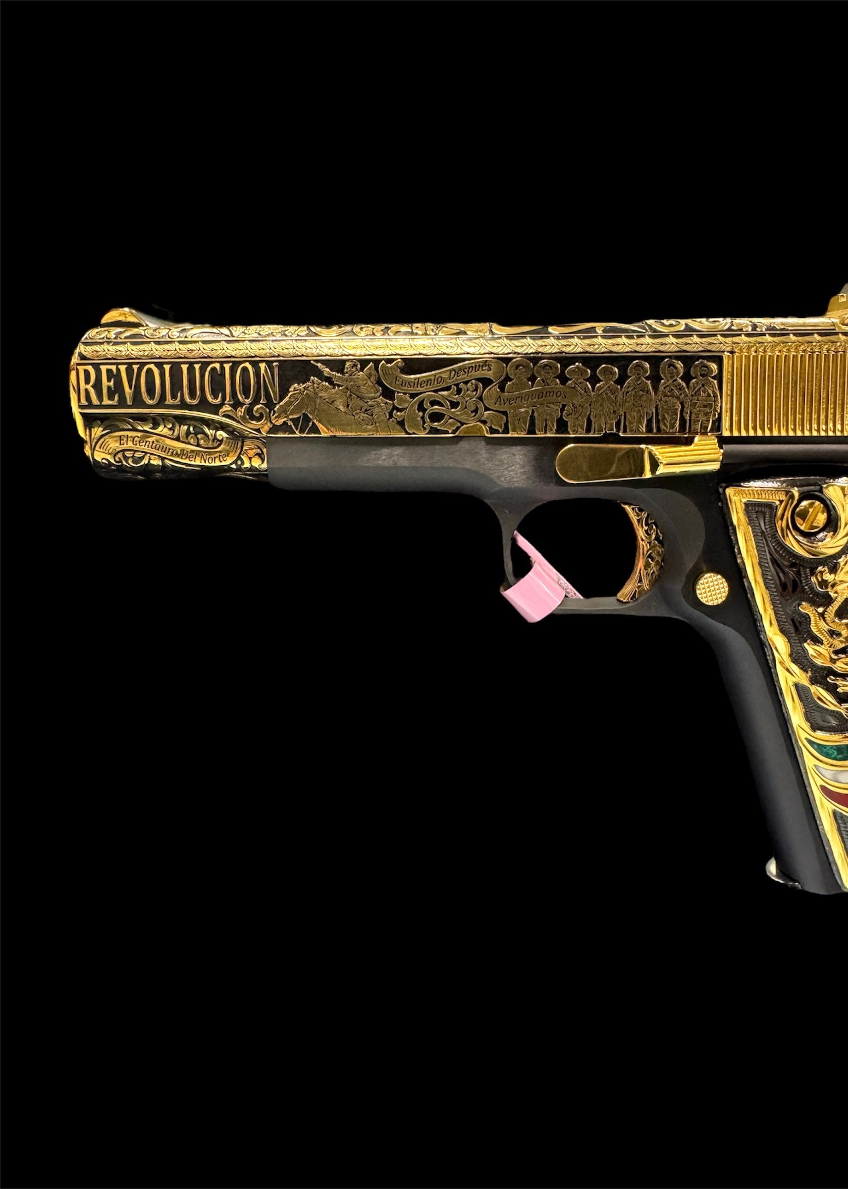 Custom 24K gold plated eagle and Mexico flag in green, pearl white and red resin on black engraved grips. .