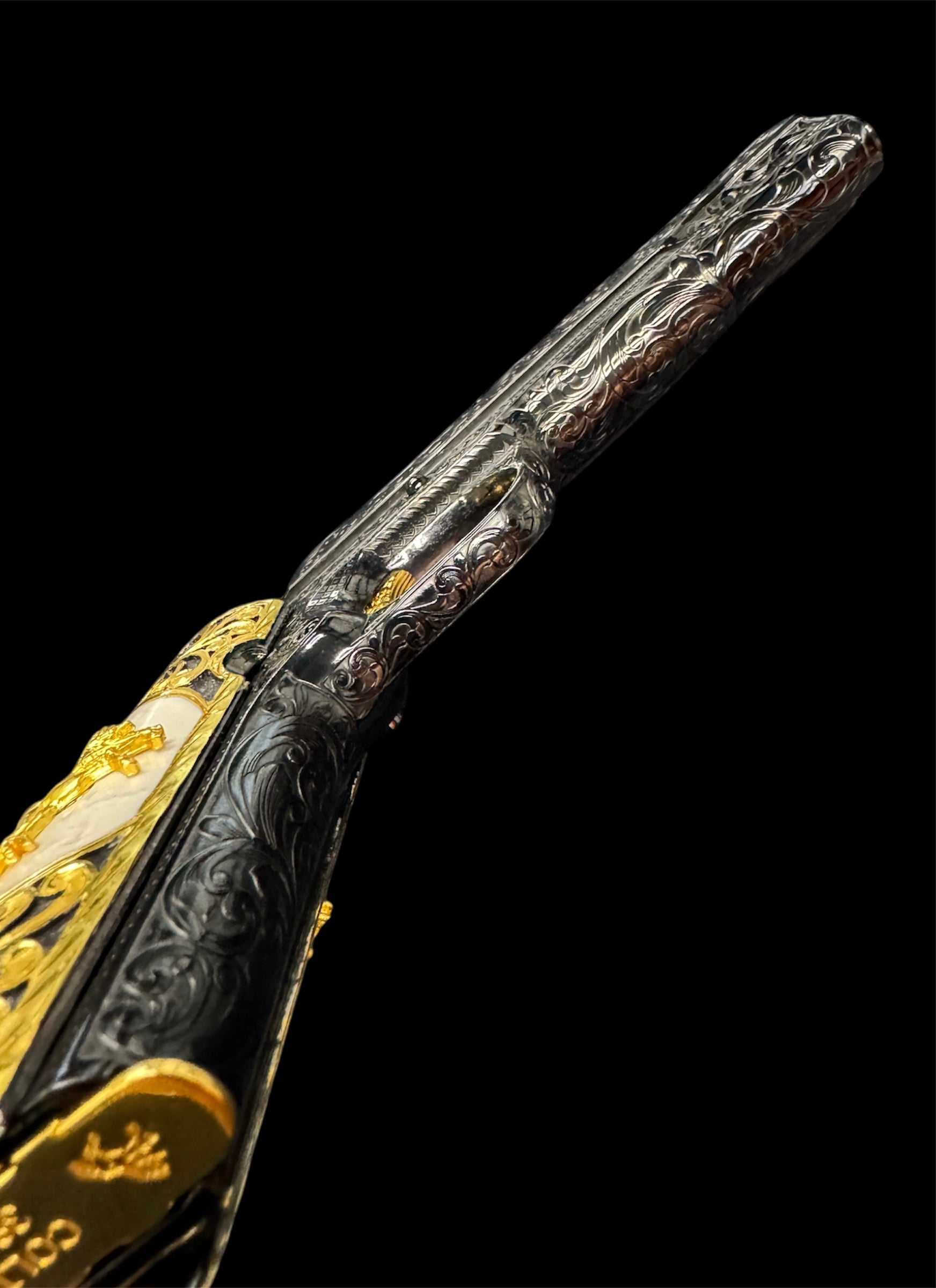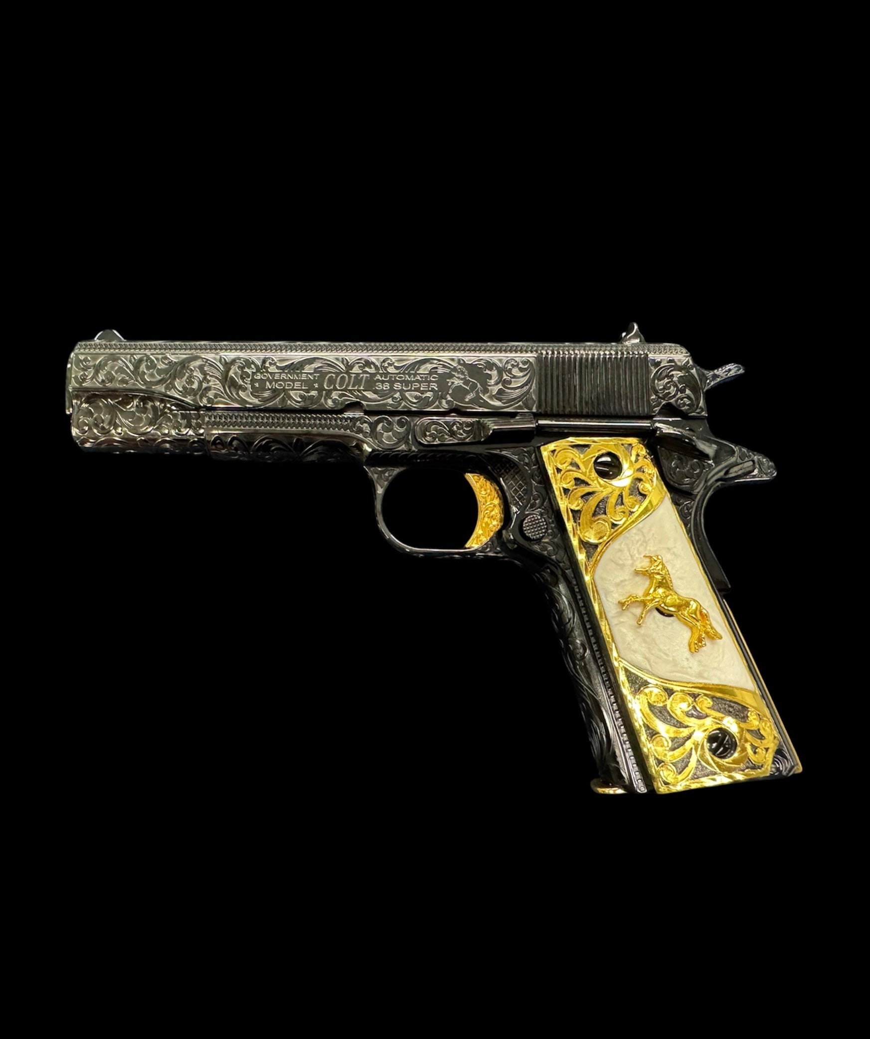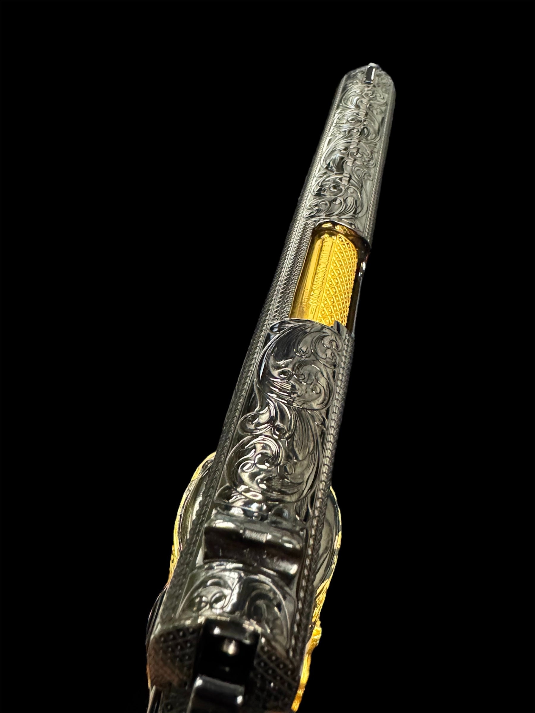 High polished 24K bright gold plated trigger, main spring housing, mag and barrel.