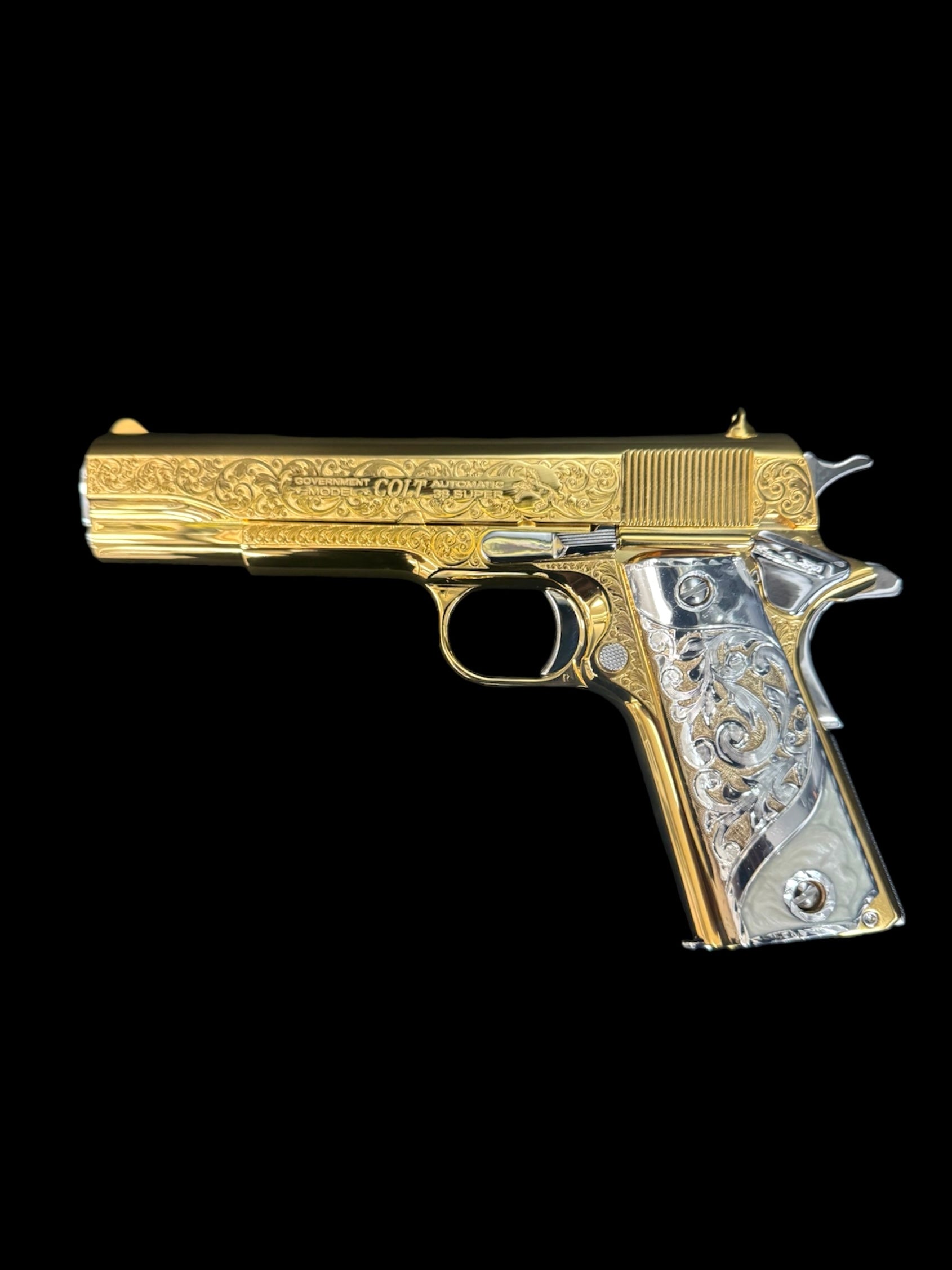 Nickel plated scroll grips with 24K real gold plated and white pearl resin.