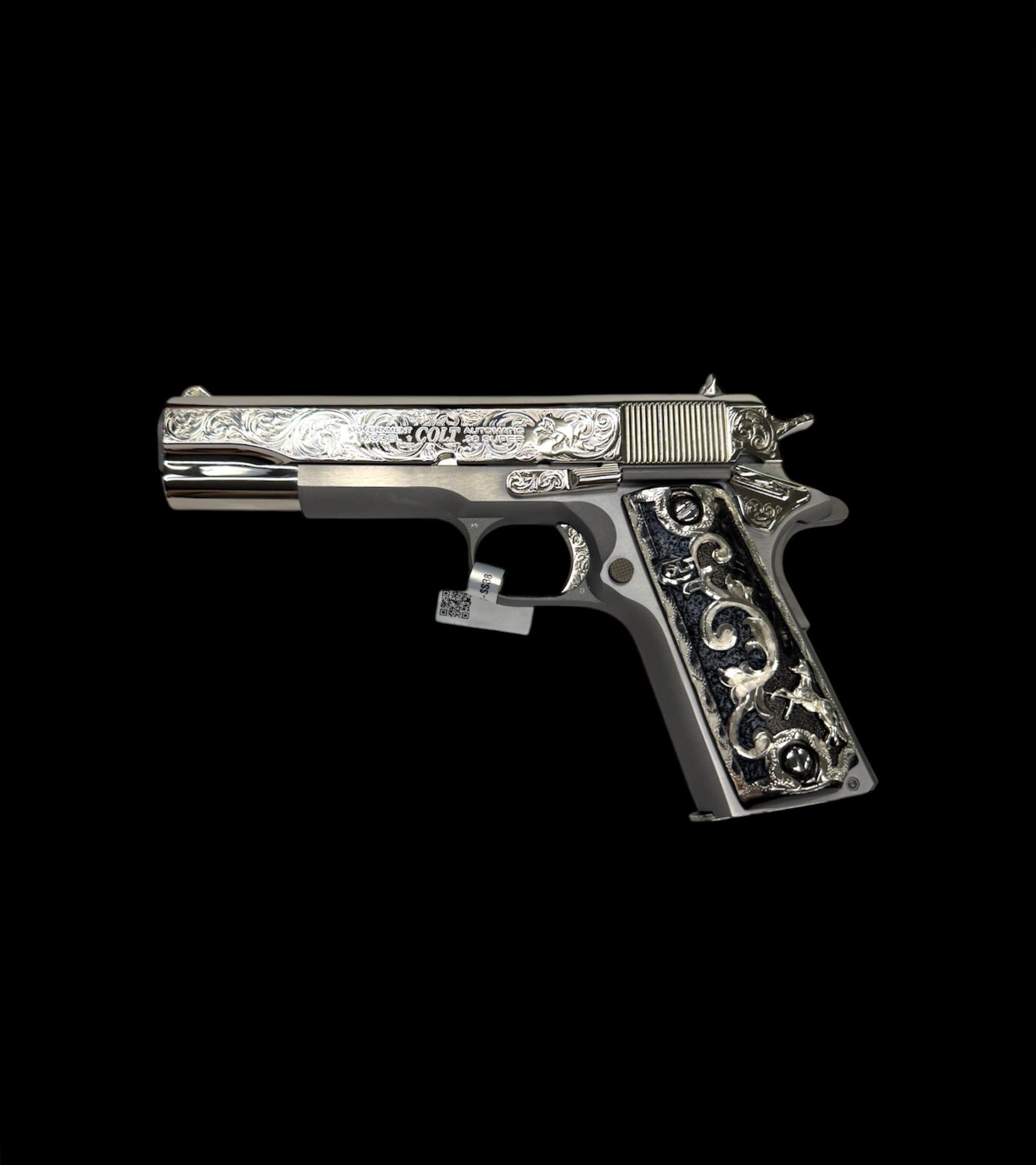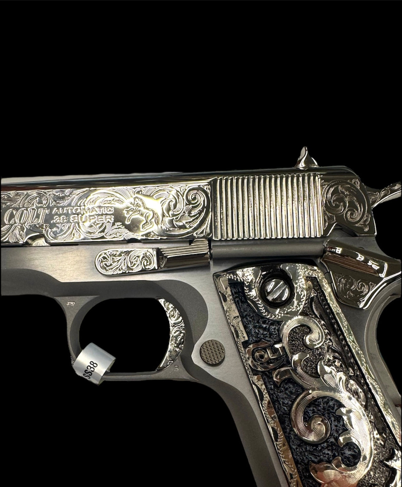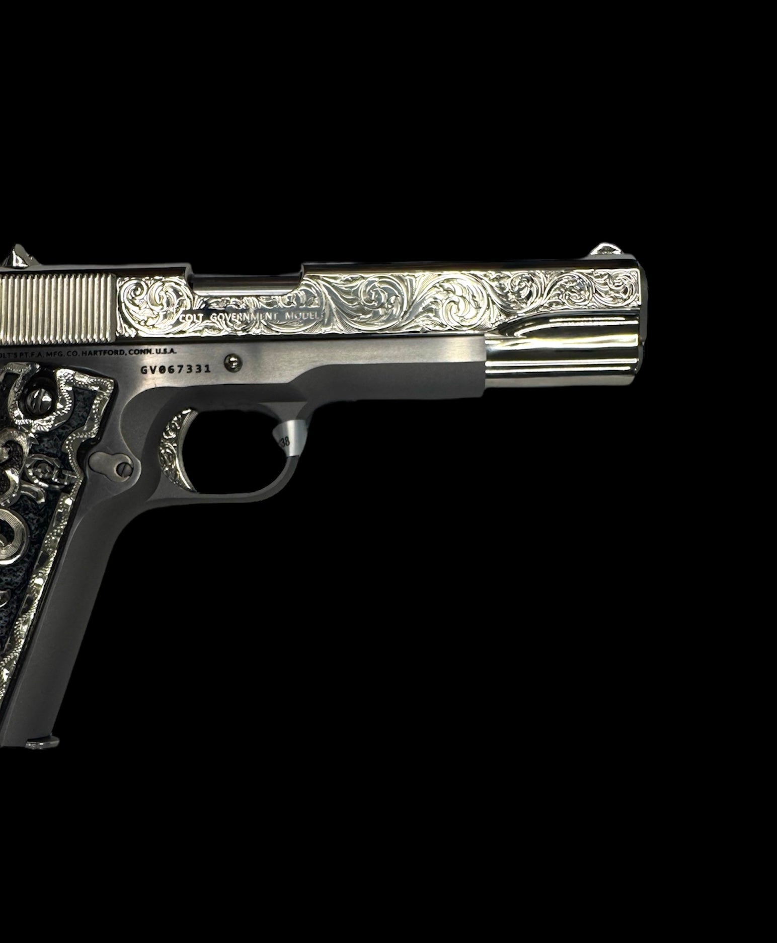 Custom “hand style” laser engraved sides of slide, trigger, slide stop, safety and hammer.