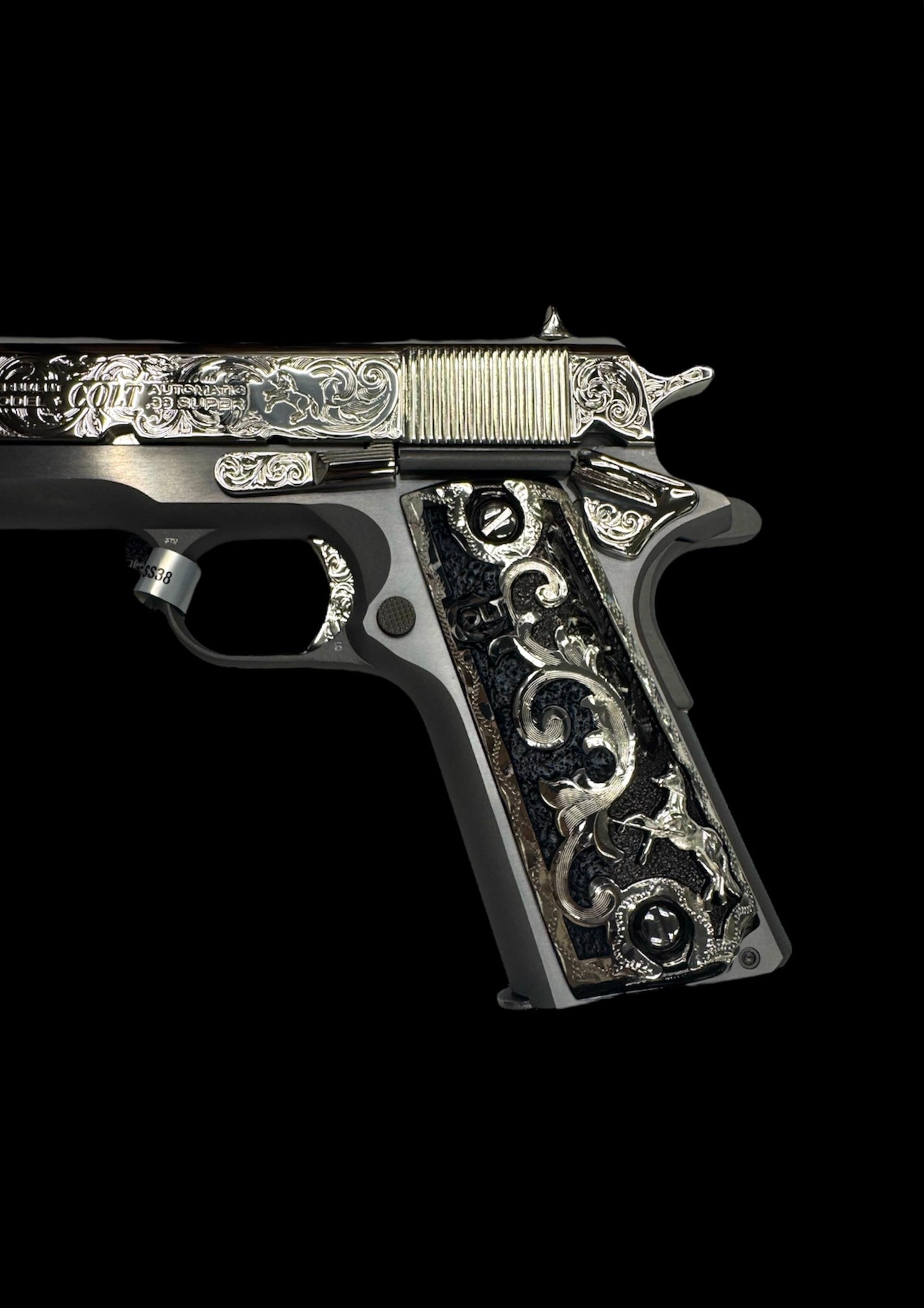 Nickel plated Colt horse and engraved scrolls on black grips with black pearl resin.