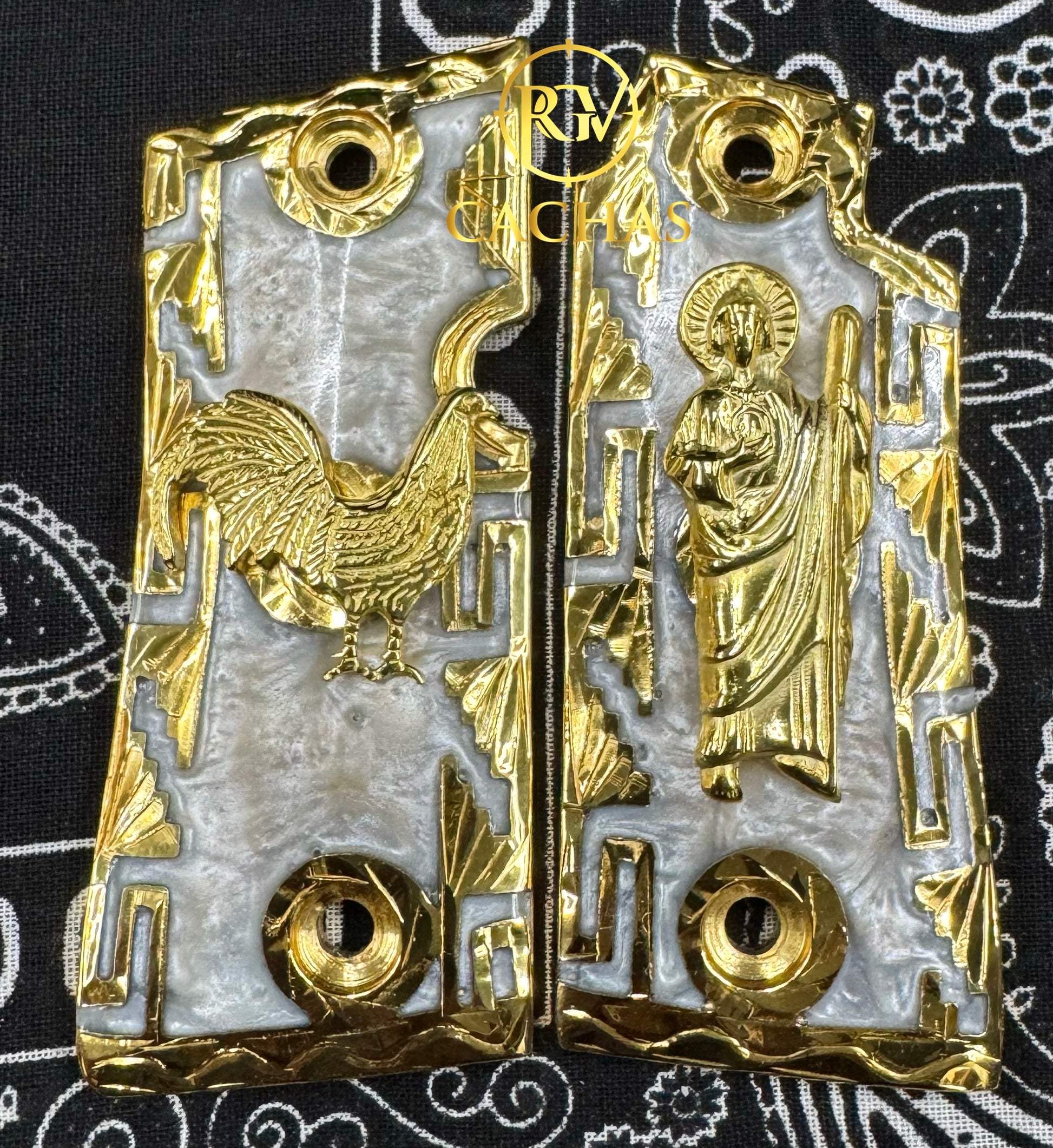 24K Real gold plated San Judas and Gallo grips with white pearl resin.