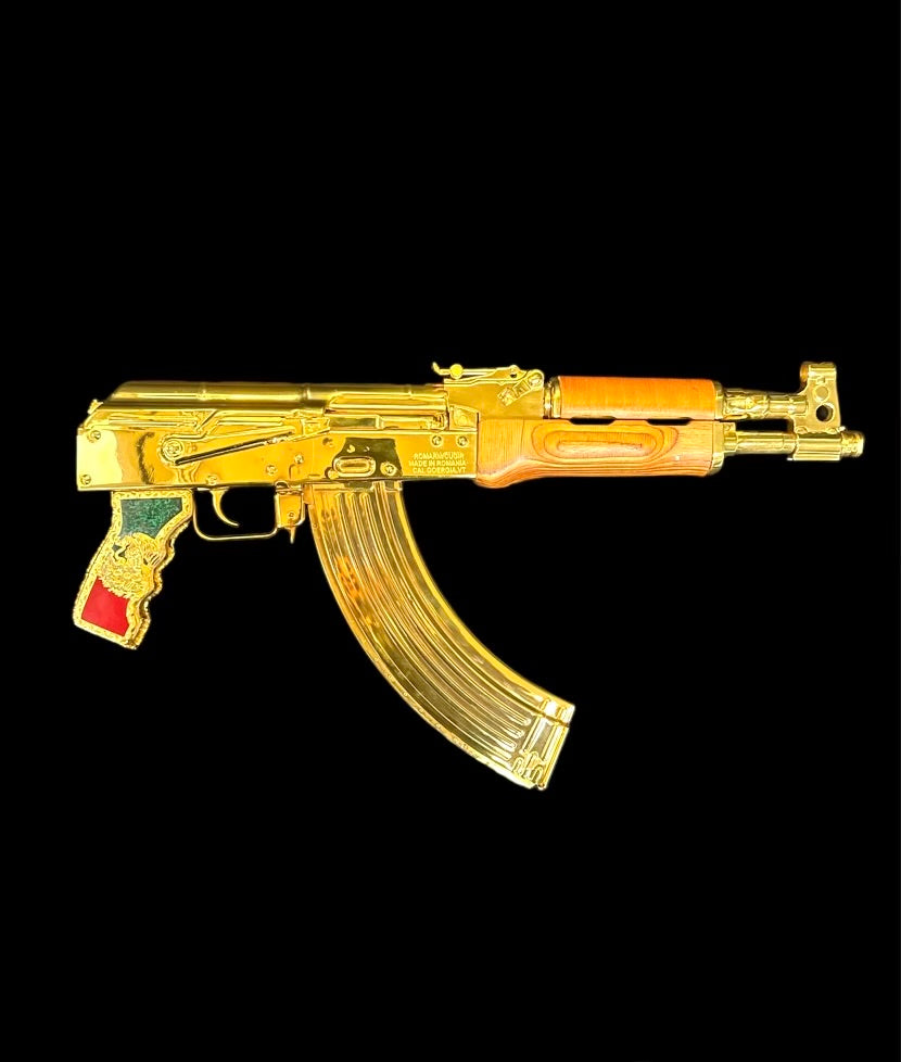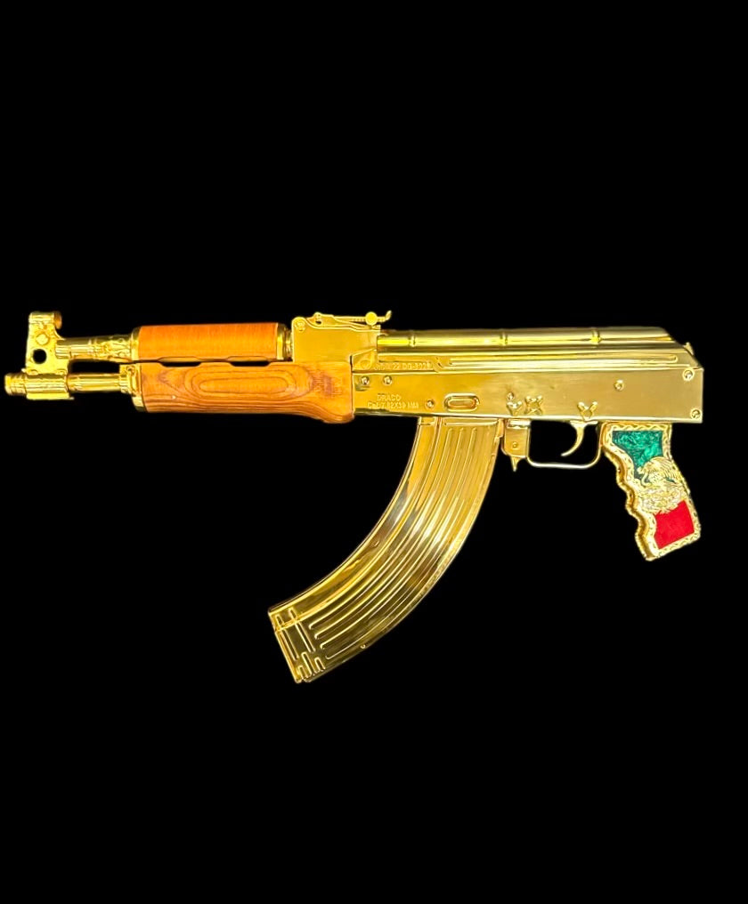 24K bright gold plated grip eagle engraved with green and red resin. Wood furniture handguard.